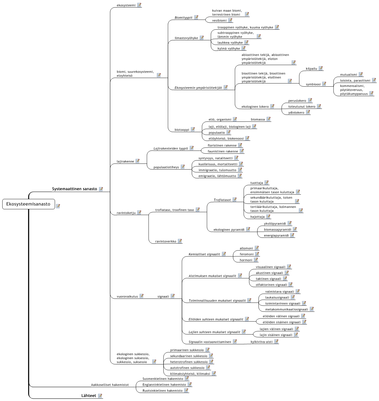 Systemaattinen sanasto ekosysteemi biomi, suurekosysteemi, eloyhteisö Biomityypit kuivan maan biomi, terrestrinen biomi vesibiomi ilmastovyöhyke trooppinen vyöhyke, kuuma vyöhyke subtrooppinen vyöhyke, lämmin vyöhyke lauhkea vyöhyke kylmä vyöhyke Ekosysteemin ympäristötekijät abioottinen tekijä, abioottinen ympäristötekijä, eloton ympäristötekijä bioottinen tekijä, bioottinen ympäristötekijä, elollinen ympäristötekijä kilpailu symbioosi mutualismi loisinta, parasitismi kommensalismi, pöytätoveruus, pöytäkumppanuus ekologinen lokero peruslokero toteutunut lokero ydinlokero biotooppi eliö, organismi biomassa laji, eliölaji, biologinen laji populaatio eliöyhteisö, biokenoosi lajirakenne Lajirakenteiden tyypit floristinen rakenne faunistinen rakenne populaatiotiheys syntyvyys, nataliteetti kuolleisuus, mortaliteetti immigraatio, tulomuutto emigraatio, lähtömuutto ravintoketju trofiataso, troofinen taso Trofiatasot tuottaja primaarikuluttaja, ensimmäisen tason kuluttaja sekundäärikuluttaja, toisen tason kuluttaja tertiäärikuluttaja, kolmannen tason kuluttaja hajottaja ekologinen pyramidi yksilöpyramidi biomassapyramidi energiapyramidi ravintoverkko vuorovaikutus signaali Kemialliset signaalit allomoni feromoni hormoni Aistimuksen mukaiset signaalit visuaalinen signaali akustinen signaali taktinen signaali olfaktorinen signaali Toiminnallisuuden mukaiset signaalit valmistava signaali laukaisusignaali toimintavireen signaali metakommunikaatiosignaali Eliöiden suhteen mukaiset signaalit eliöiden välinen signaali eliöiden sisäinen signaali Lajien suhteen mukaiset signaalit lajien välinen signaali lajin sisäinen signaali Signaalin vastaanottaminen kylkiviiva-aisti ekologinen sukkessio, ekologinen suksessio, sukkessio, suksessio primaarinen sukkessio sekundaarinen sukkessio heterotrofinen sukkessio autotrofinen sukkessio kliimaksiyhteisö, kliimaksi Aakkoselliset hakemistot Suomenkielinen hakemisto Englanninkielinen hakemisto Ruotsinkielinen hakemisto Lähteet