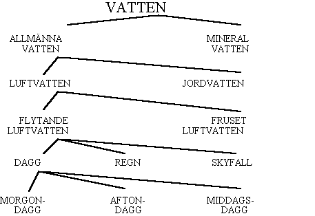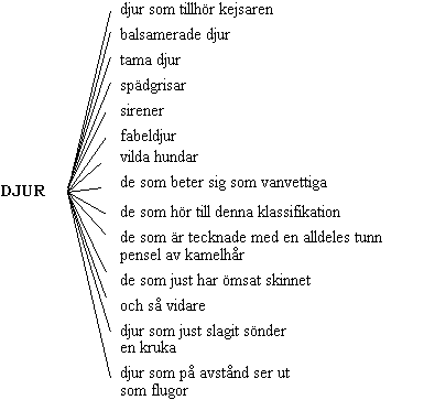 Figur 3. En gammal kinesisk klassifikation av djur (t.ex. i Foucault 1989; Jorge Luis Borges 1952; Rosing 1992) Detta är ett klassiskt exempel på för oss ologiskt tänkande och det förekommer i läroböcker för klassifikationsteori eller vetenskapsteori, men också terminologiforskare har upptäckt det och använt det som ett belysande exempel. Klassifikationen sägs härstamma från en urgammal kinesisk encyklopedi En himmelsk samling nyttiga insikter. Den är ett bevis antingen på kinesisk humor eller på Jorge Luis Borges säregen stil. Det är nämlinen Borges som påstår att doktor Franz Kuhn skulle ha funnit encyklopedin. (Kuhn har givetvis översatt t.ex. kinesiska dikter till tyska, men kan man lita på Borges?) När man utarbetar klassifikationer eller begreppssystem borde man egentligen inte blanda ihop flera olika kriterier såsom man har gjort i exemplet ovan. Det blir oklart vad som är avsikten med det; vi har svårt att förstå varför t.ex. "vilda hundar" eller "fabeldjur" eller "djur som på avstånd ser ut som flugor" hör till samma system. Det är också säkert flera begrepp som faller utanför denna klassifikation. Vi har alltså flera olika möjligheter att systematisera begrepp och ett och samma begrepp kan höra till flera olika begreppssystem. Vanligen måste man bestämma sig för en systemtyp som basis t.ex. för en ordlista, en artikel osv. I en systematisk fackordlista är det viktigt att presentationen av ett begreppssystem inte blir för invecklad och att sambanden mellan begreppen är tydliga och ordningsprinciperna klara. Kriterierna skall också vara så enkla som möjligt. Med hjälp av datorn kan vi presentera komplicerade samband mellan begrepp och på så sätt knyta ihop olika typer av begreppssystem med gemensamma begrepp till ett stort flerdimensionellt makrosystem. Principer för strukturering av sådana system behövs och utvecklas bl.a. vid forskning i artificiell intelligens, hypertext och databaser. Speciellt i samband med hypertext talas det mycket om möjligheterna att navigera fritt utgående från ens egna associationer i en databas när man söker information. Något överdrivet kan man säga att de traditionella databaserna liknar alfabetiska ordböcker: användaren måste känna till det rätta ordet för att hitta begreppets definition eller en översättningsekvivalent. Om man inte har de rätta orden i minnet är ordboken eller databasen till föga nytta. Det är säkert många som har haft frustrerande upplevelser med olika slags uppslagsverk och söksystem. Systematiska ordlistor och strukturerade databaser ger flera olika möjligheter. Vid sidan av alfabetiska register och sökord är det dessutom möjligt att utnyttja den systematiska ordningen och hitta fram till den sökta informationen även om man inte vet de riktiga termerna som används för ett visst begrepp. Men innan detta är möjligt skall någon analysera begreppen, strukturera de olika begreppssystemen och skapa de länkar som användaren kan välja emellan. Det är speciellt dessa behov som jag har haft i tankarna i min avhandling. Till slut vill jag konstatera att begreppssystem erbjuder ett intressant forskningsobjekt och jag upplever att denna undersökning har öppnat vägen till ett stort forskningsområde. I fortsättningen är det framför allt de olika tillämpningsmöjligheterna som jag kommer att koncentrera mig på, vilket inte har varit möjligt i samband med detta arbete. Källor Borges, Jorge Luis (1993) John Wilkinsin analyyttinen kieli. (Orig. El idioma analítico de John Wilkins 1952) I Borges: Haarautuvien polkujen puutarha. WSOY. Foucault, Michel (1989). Die Ordnung der Dinge. (Orig. Les mots et les choses 1966). Frankfurt am Main: Suhrkamp. Linné, von Carl (1735). Systema Naturæ, Holland; citerad ur Malmeström, Elis: Carl von Linné. Geniets kamp för klarhet. Stockholm 1964. Nuopponen, Anita (1994). Begreppssystem för terminologisk analys. Doktorsavhandling. Acta Wasaensia, Vasa. Rosing, Hans (1992). Vetenskapens logiska grunder. Sjunde upplagan. Hangö: Schildts. Texten är Lektio Praecursoria från disputationen den 10.9.1994, då jag försvarade min doktorsavhandling "Begreppssystem för terminologisk analys". Som opponenter fungerade Bengt Sigurd och Heribert Picht och som kustos Christer Laurén. |